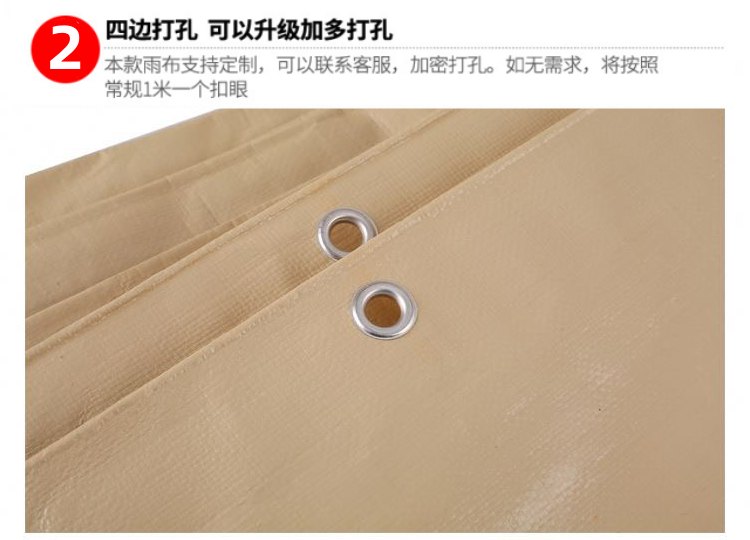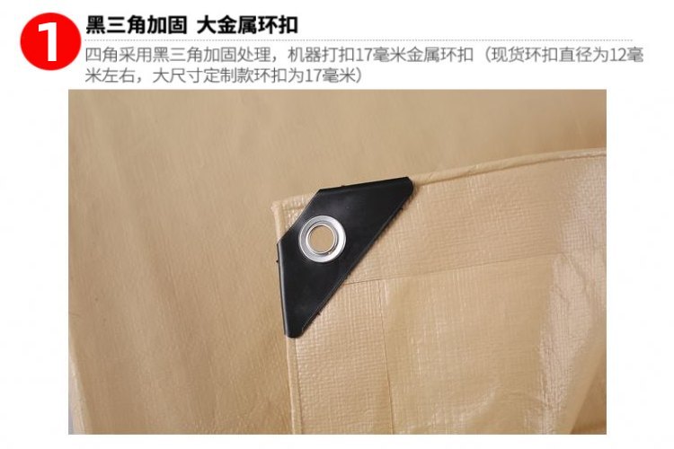 產(chǎn)品介紹肉色PE防水篷布加厚包角,四角采用黑三角加固處理,大金屬環(huán)扣,機(jī)器打扣17mm金屬環(huán)扣。肉色PE防水篷布四邊打孔,默認(rèn)常規(guī)1米一個(gè)···